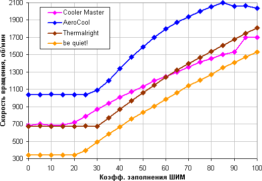 Лучшее поведение — у вентиляторов Thermalright и be quiet!: широкий диапазон регулировки по скорости вращения и снижение скорости уже при КЗ 95%. Чуть хуже у Cooler Master и совсем плохо у AeroCool. При снижении КЗ до 0 вентиляторы не останавливаются. Это может иметь значение, если пользователь хочет создать гибридную систему охлаждения, которая при низкой нагрузке работает полностью или частично в пассивном режиме.