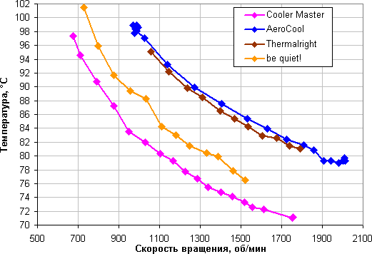 Зависимость температуры процессора при его полной загрузке от скорости вращения вентиляторов: