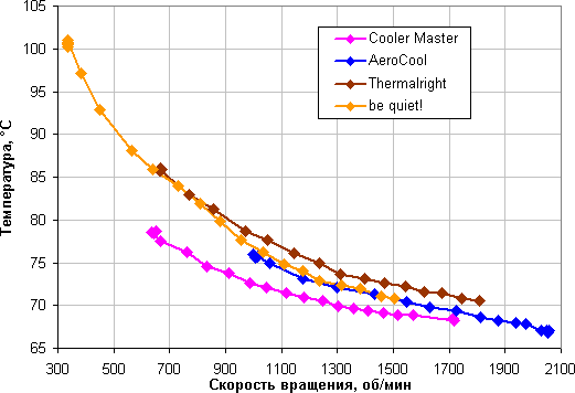 Процессор при одинаковых скоростях вращения вентиляторов холоднее всего в случае кулера Cooler Master, что не удивительно, так как вентиляторов у него два. Среди кулеров с одним вентилятором явное преимущество у be quiet!.