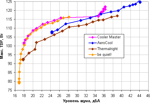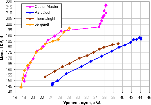 Формально Cooler Master в тихом режиме лучше всех, однако отставание be quiet! минимально. Максимальную охлаждающую способность продемонстрировал AeroCool (видимо, сыграли роль пять тепловых трубок и высокооборотистый вентилятор), но это при шуме в 44 дБА. Еще раз уточним, что данные по мощности приведены для жестких условий обдува радиатора нагретым до 44 градусов воздухом; при снижении температуры воздуха указанные пределы мощности для бесшумной работы и максимальной мощности возрастают.