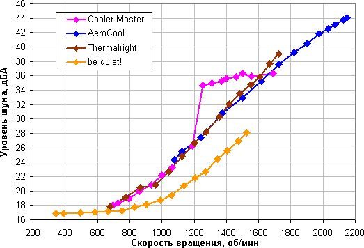 Самым тихим стоит признать кулер be quiet!, который полностью оправдывает свое название. Остальные шумят более-менее одинаково, за исключением диапазона высоких скоростей у Cooler Master — там наблюдается какой-то резонанс, приводящий к увеличению шума. Резонанс пропадает при снижении скорости вращения до 1200 об/мин. Отметим, что максимальная скорость выше у вентилятора AeroCool, но и шумит он на этой скорости громче всех. Также у вентилятора этого кулера на оборотах, близких к максимальным, иногда появлялось громкое постукивание, которое могло через какое-то время исчезнуть. Во время замеров шума постукивание не появилось, так что кулеру повезло — на результатах тестирования этот дефект не сказался.