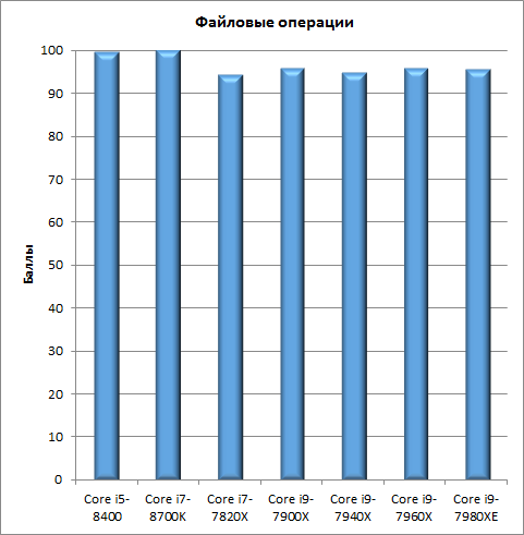 Естественно, загрузка процессора в данной группе тестов практически отсутствует, а результаты определяются лишь производительностью накопителя и подсистемой ввода/вывода платы. У чипсета Intel X299 подсистема ввода/вывода более тормозная, чем у чипсета Intel Z370 (это было проверено неоднократно), поэтому результаты процессоров Core i5-8400 и Core i7-8700K в данных тестах одинаковые и чуть лучше, чем для у процессоров семейства Core-X.