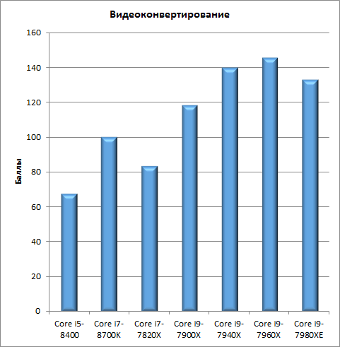 Интересно, что в тесте на основе приложений VidCoder результаты для процессоров Core i7-8700K, Core i9-7940X, Core i9-7960X, Core i9-7980XE получаются практически одинаковыми.