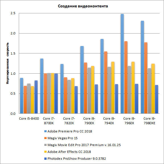 По интегральному результату производительности в группе «Создание видеоконтента» ситуация почти такая же, как в предыдущем случае, то есть лидирует процессор Core i9-7960X, который демонстрирует результат даже немного выше, чем Core i9-7980XE.