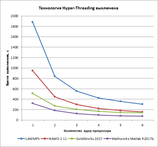 Результаты тестирования при отключенной технологии Hyper-Threading приведены далее. Собственно, здесь получаются очень похожие зависимости, но при отключенной технологии Hyper-Threading зависимость результатов от числа ядер процессора выражена еще более ярко. Теперь при переходе от одного к шести ядрам процессора время выполнения теста сокращается в 6,2 и 6,1 раза для тестов на основе приложений NAMD 2.11 и LAMMPS, а для тестов на основе приложений Dassault SolidWorks 2017 с пакетом Flow Simulation 2017 и Mathworks Matlab R2017b ускорение составляет 3,6 и 4,4 раза соответственно.