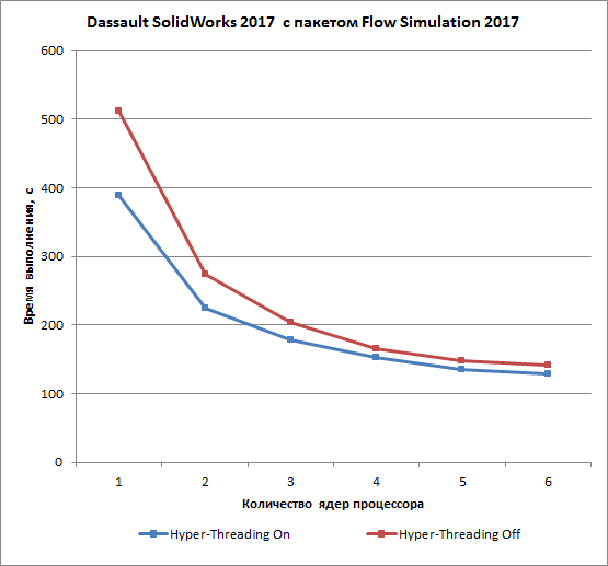 В приложении Dassault SolidWorks 2017 с пакетом Flow Simulation 2017 использование технологии Hyper-Threading сокращает время расчета на 24% в случае одного ядра, но при увеличении числа ядер до шести сокращение времени расчета уменьшается до 9%.