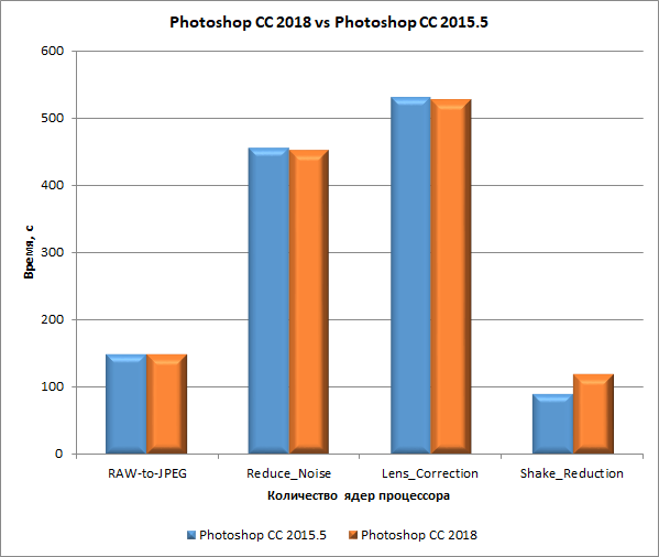С остальными фильтрами (Reduce Noise, Lens Correction) и конвертированием RAW-файлов в JPEG такого эффекта не наблюдается: здесь Adobe Photoshop CC 2015.5 и Adobe Photoshop CC 2018 выдают абсолютно одинаковые результаты. Вследствие этого дальше мы приводим результаты тестирования только для Adobe Photoshop CC 2018.