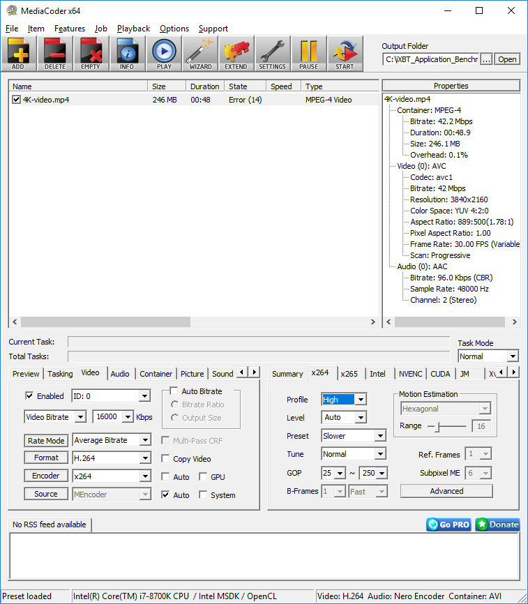 При тестировании мы используем тот же 4K-видеофайл, что и в случае программы HandBrake. Исходный видеофайл конвертируется c использованием кодека H.264 (x264) в контейнер AVI с уменьшением размера кадра до 1920×1080 и уменьшением видеобитрейта до 16 Мбит/с.