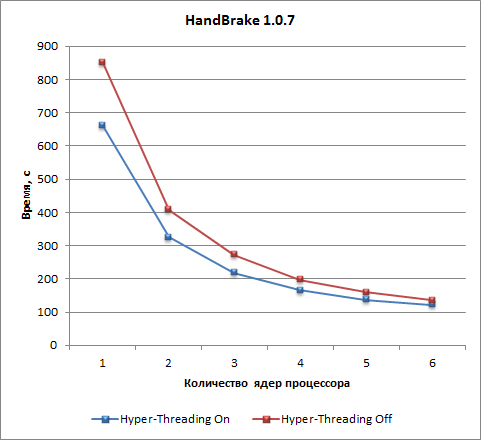 Для теста на основе приложения HandBrake использование технологии Hyper-Threading сокращает время видеоконвертирования примерно на 20% при числе ядер от одного до трех, а при дальнейшем росте числа ядер сокращение времени видеоконвертирования начинает уменьшаться и составляет только 10% при шести ядрах.