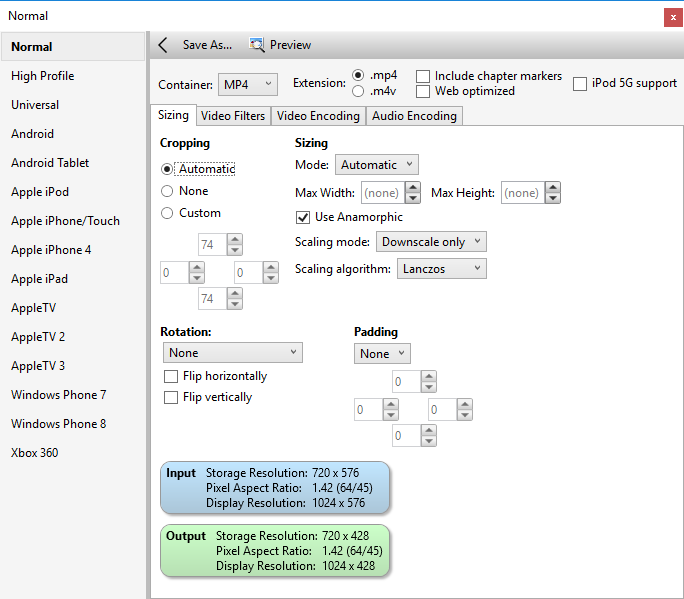 HandBrake — это бесплатный видеоконвертер из любого формата видео с открытым исходным кодом. Есть версии для macOS, Windows и Linux. Для Windows имеются 32-битная и 64-битная версия программы. Утилита содержит огромное количество различных пресетов конвертирования (например, под устройства Apple iPod, iPhone, iPad, Apple TV, Android и др.), а также позволяет задавать параметры конвертирования вручную.