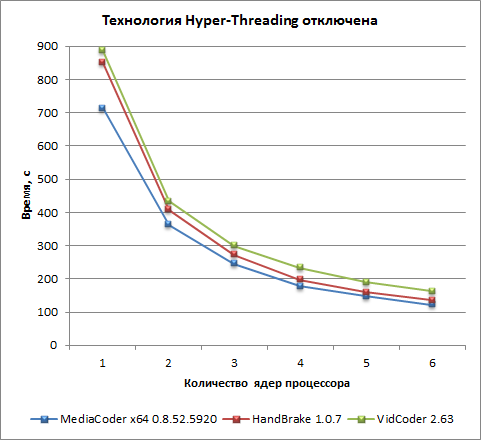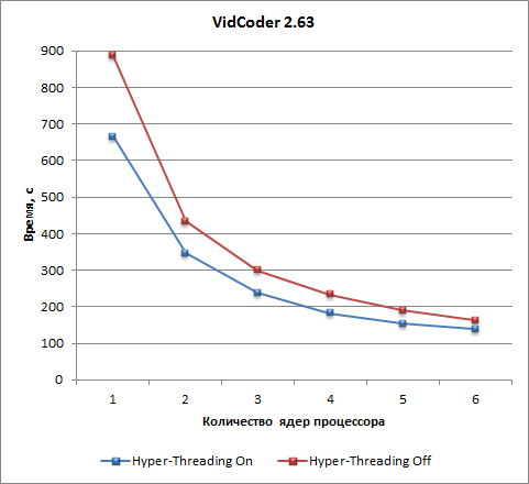 Для теста на основе приложения MediaCoder использование технологии Hyper-Threading позволяет сократить время видеоконвертирования примерно на 20% при любом (от 1 до 6) числе ядер процессора.