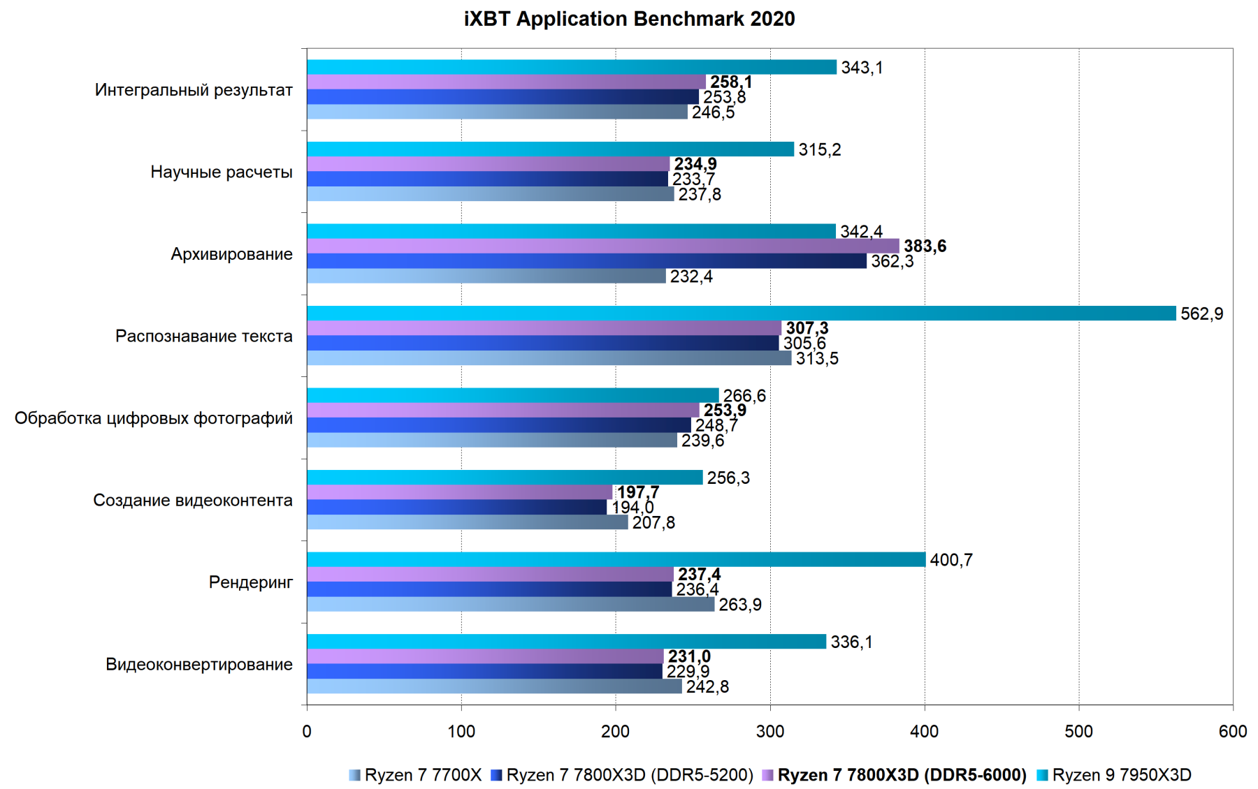 В подробном анализе результатов нет особого смысла, кратко подметим лишь наиболее важные моменты. Средний результат от установки более производительной памяти DDR5-6000 вместо DDR5-5200 повысился всего на 2%. К слову, это совпадает и с разницей при сравнении Ryzen 7 7800X3D и 7700X — дополнительный кэш принес лишь чуть больше. А сегодня основной вклад в улучшение интегральной производительности добавило архивирование файлов со сжатием — в этом разделе прирост снова оказался равным весьма приличным 6%.