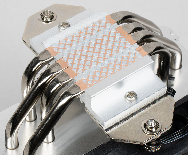Кулер оснащен вынесенным радиатором, к которому тепло от подошвы передается по четырем тепловым трубкам. Трубки, разумеется, медные. Снаружи они никелированные. У подошвы теплосъемника трубки сплющены и впрессованы в толстую алюминиевую пластину. Прилегающие к процессору плоскости трубок сошлифованы и слегка отполированы. На подошве теплосъемника между трубками и ребрами подошвы выраженных канавок нет. Рабочая плоскость теплосъемника практически идеально плоская.