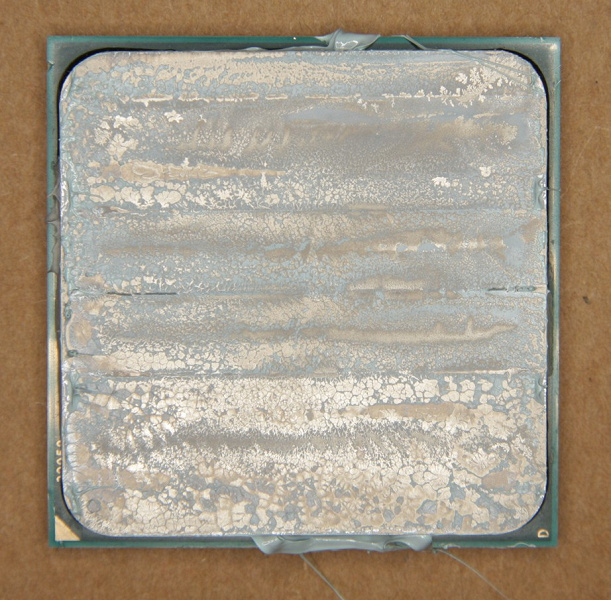 Видно, что термопаста распределилась тонким слоем по всей плоскости крышки процессора, а ее избыток выдавился по краям. Пятно плотного контакта большое.
