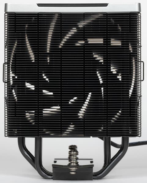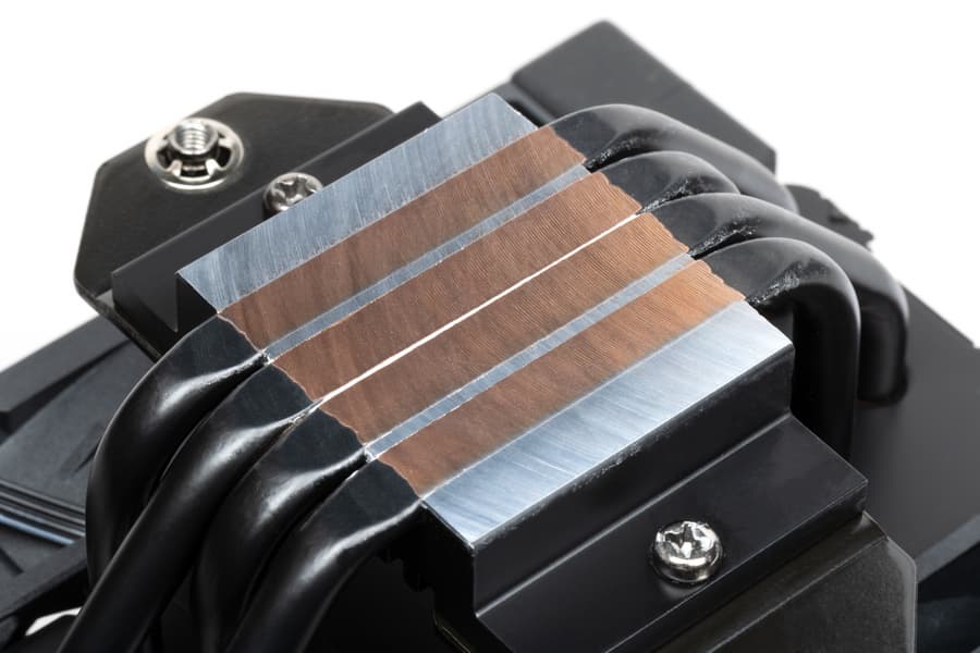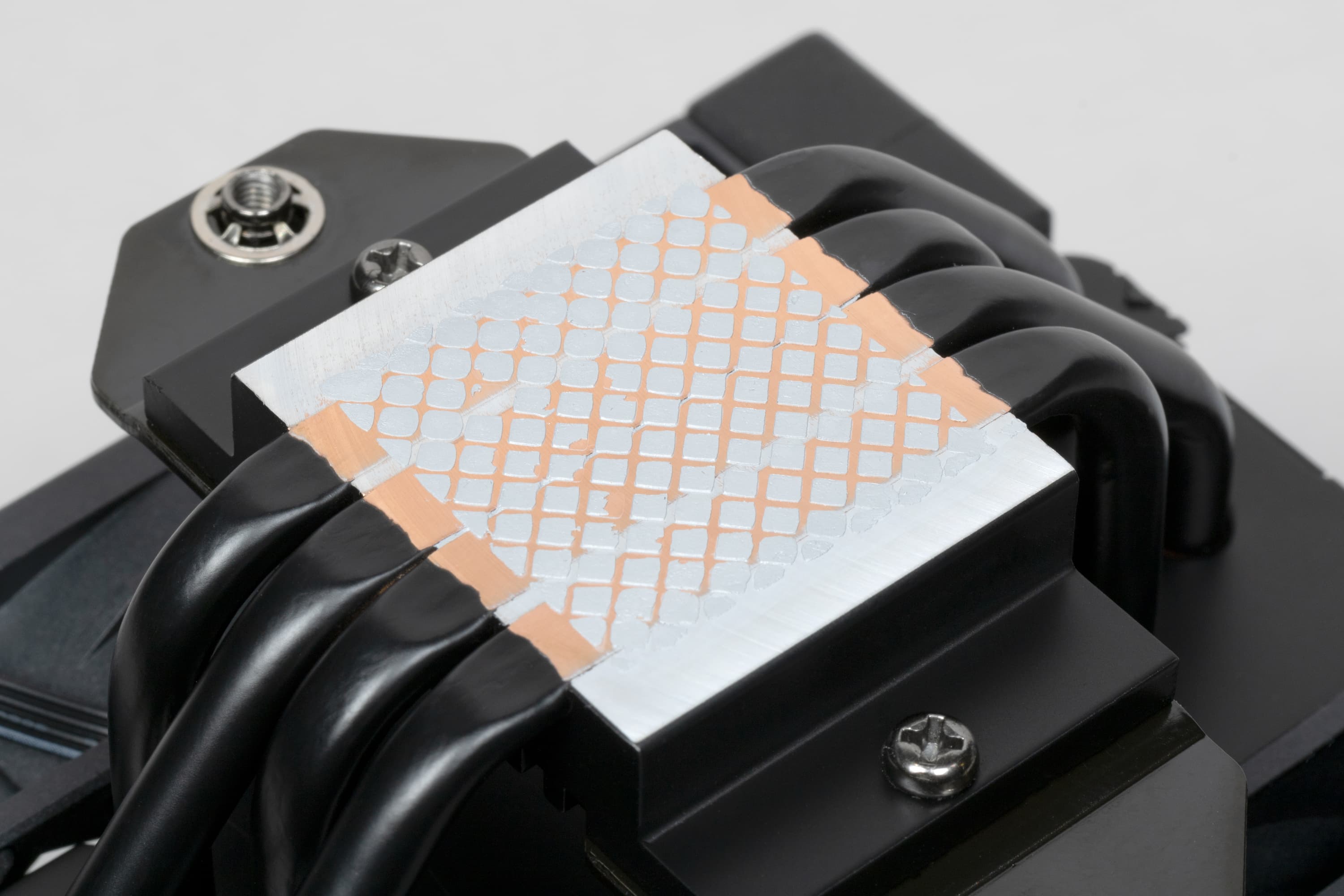 Кулер оснащен вынесенным радиатором, к которому тепло от подошвы передается по четырем тепловым трубкам. Трубки, разумеется, медные. Снаружи они, как и пластины радиатора и часть деталей крепежа имеют черное полуматовое лакокрасочное покрытие. У подошвы теплосъемника трубки сплющены и впрессованы в толстую алюминиевую пластину. Прилегающие к процессору плоскости трубок и этой пластины сошлифованы и слегка отполированы. На подошве теплосъемника по краям трубок выраженная канавка есть только между центральными трубками. Рабочая плоскость теплосъемника практически идеально плоская.