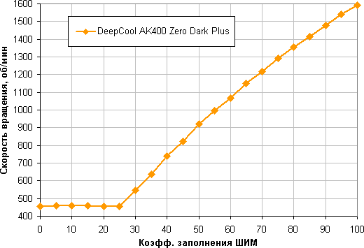 Отличный результат — плавный рост скорости вращения при изменении коэффициента заполнения (КЗ) от 25% до 100% и довольно широкий диапазон регулировки. Отметим, что при КЗ 0% вентилятор не останавливается, поэтому в гибридной системе охлаждения с пассивным режимом на минимальной нагрузке такие вентиляторы придется останавливать, снижая напряжение питания.