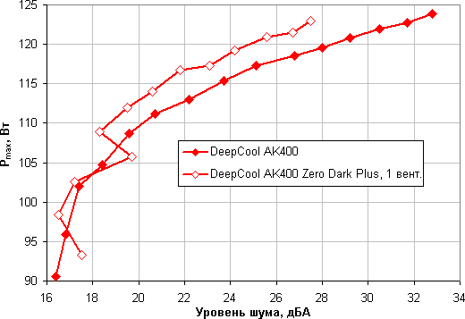 Видно, что за исключением выбросов, обусловленных резонансными явлениями, даже с одним вентилятором AK400 Zero Dark Plus работает немного лучше, чем AK400. Причины этого не совсем понятны, но вряд ли такое влияние оказал черный цвет радиатора.