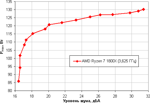 Приняв 25 дБА за критерий условной бесшумности, получим примерную максимальную мощность процессоров типа AMD Ryzen 7 1800X, соответствующих этому уровню, это порядка 125 Вт (это на 5 Вт выше, чем в случае DeepCool AK400). Гипотетически, если не обращать внимания на уровень шума, пределы мощности можно увеличить где-то до 130 Вт.
