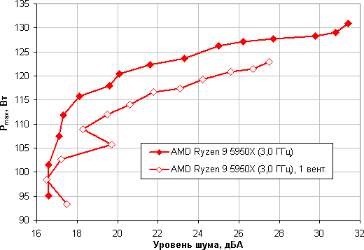 Приняв 25 дБА за критерий условной бесшумности, получим, что максимальная мощность процессора, соответствующая этому уровню, составляет порядка 126 Вт (на 9 Вт выше, чем в случае DeepCool AK400). Если не обращать внимания на уровень шума, то предел мощности можно увеличить где-то до 131 Вт. Еще раз уточним: это в жестких условиях обдува радиатора нагретым до 44 градусов воздухом. При снижении температуры воздуха указанные пределы мощности для бесшумной работы и максимальной мощности возрастают. Поэтому при условии достаточно хорошей вентиляции в корпусе данный кулер как-то справится с охлаждением процессора AMD Ryzen 9 5950X, но на возможность какого-либо разгона рассчитывать уже не стоит. В случае одного вентилятора при 25 дБА — 120 Вт и 123 Вт максимум. То есть польза от установки второго вентилятора есть в обоих случаях.
