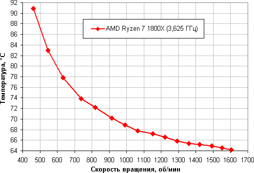 В этом тесте наш процессор AMD Ryzen 7 1800X при 24 градусах окружающего воздуха еще не перегревается при КЗ равном 25% (а это примерно 460 об/мин), так как максимально допустимая температура этого процессора равна 95 °C.