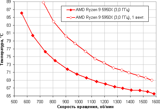 По факту в условиях теста этот процессор на данной частоте при 24 градусах окружающего воздуха не перегревается при КЗ равном 30% (а это примерно 560 об/мин вентиляторов), так как максимальная температура для AMD Ryzen 9 5950X равна 90 °C. В случае одного вентилятора — перегрева нет при КЗ равном 40% (730 об/мин)