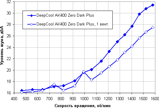Зависит, конечно, от индивидуальных особенностей и других факторов, но в случае кулеров где-то от 40 дБА и выше шум с нашей точки зрения очень высокий для настольной системы, от 35 до 40 дБА уровень шума относится к разряду терпимых, ниже 35 дБА шум от системы охлаждения не будет сильно выделяться на фоне типичных небесшумных компонентов ПК — вентиляторов корпусных, на блоке питания, на видеокарте, а также жестких дисков, а где-то ниже 25 дБА кулер можно назвать условно бесшумным. Фоновый уровень был равен 16,0 дБА (условное значение, которое показывает шумомер). Этот кулер можно считать относительно тихим устройством. Отметим слабо выраженное повышение уровня шума около 750 и 1000 об/мин, которые выражены сильнее в случае установки одного вентилятора (на вдув, разумеется). Однако в целом с одним вентилятором кулер работает заметно тише.