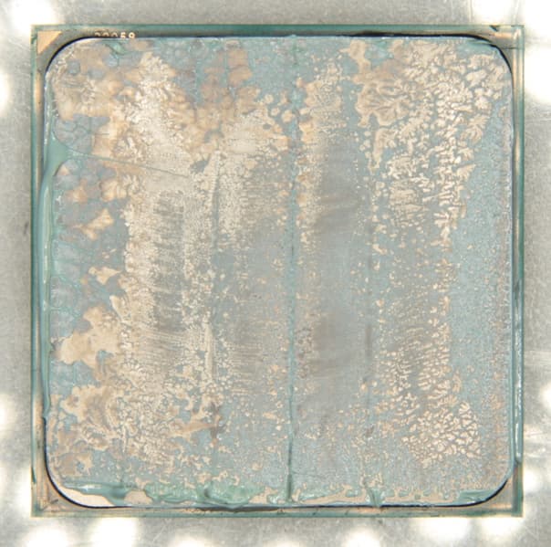 Видно, что термопаста распределилась тонким слоем по всей плоскости крышки процессора, а ее избыток выдавился по краям. Пятно плотного контакта большое. В случае процессора AMD Ryzen 9 5950X ситуация аналогичная.
