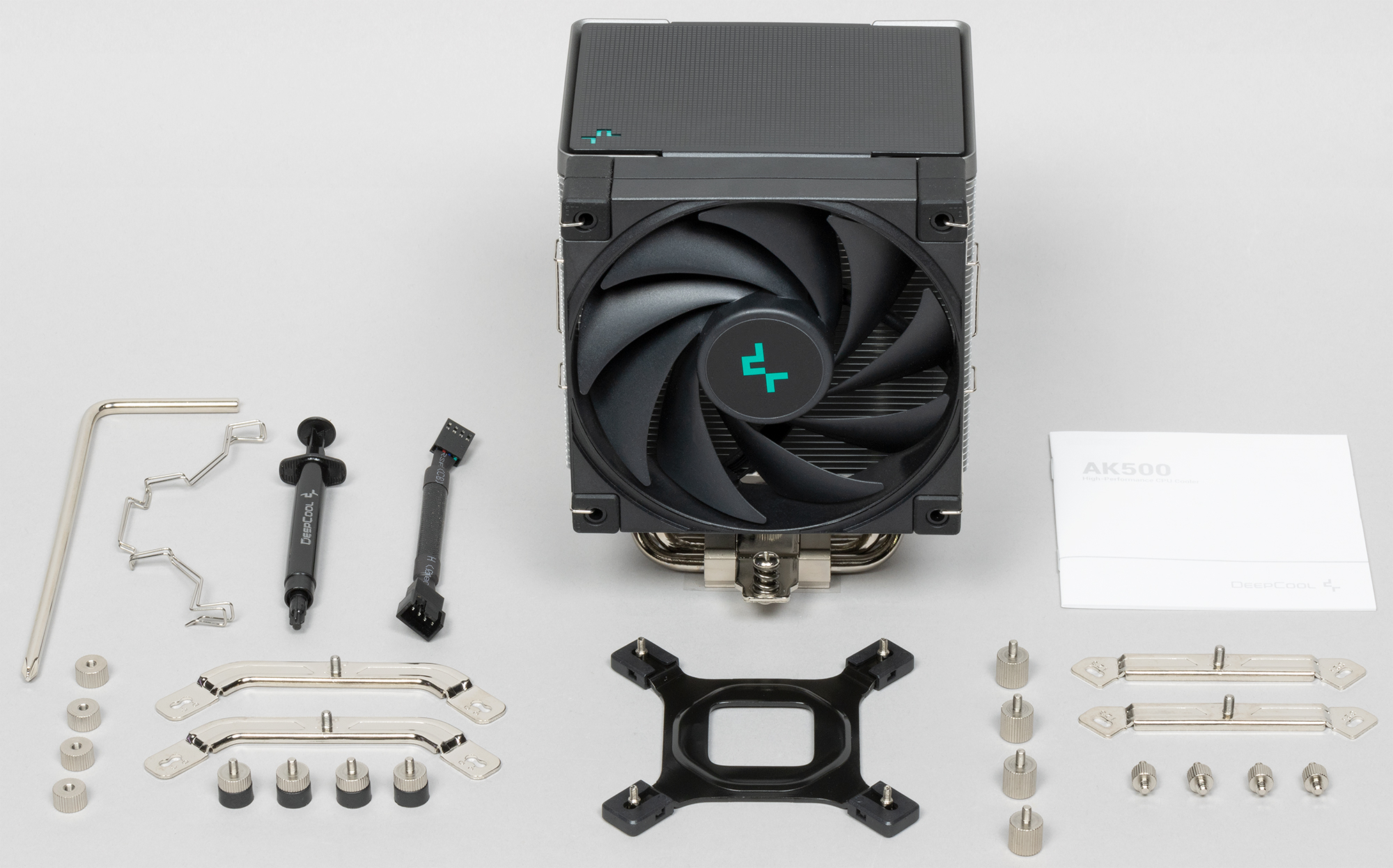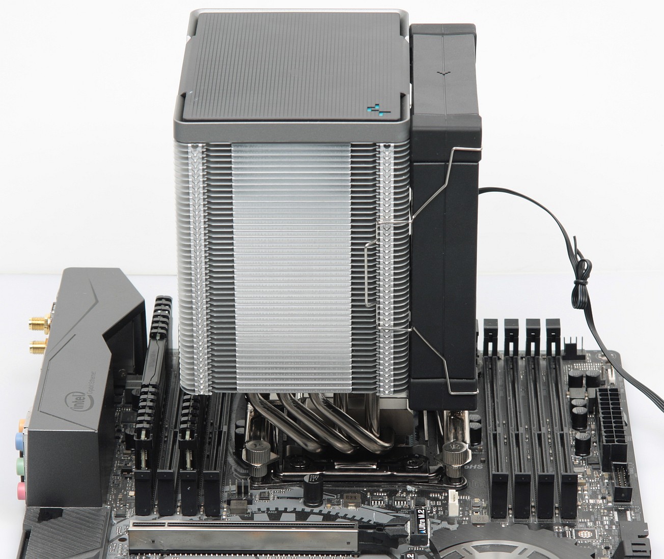 На основе кулера DeepCool AK500 можно создать условно бесшумный компьютер (уровень шума 25 дБА и ниже), оснащенный процессором типа Intel Core i9-7980XE (Intel LGA2066, Skylake-X (HCC)), если потребление процессора под максимальной нагрузкой не будет превышать 190 Вт, а температура внутри корпуса не повысится выше 44 °C. В случае чиплетного процессора AMD Ryzen 9 5950X эффективность кулера заметно ниже, и для соблюдения указанных выше условий максимальная мощность, потребляемая процессором, должна быть не выше 119 Вт, а в случае AMD Ryzen 7 1800X — 123 Вт. Для процессора Intel Core i9-13900K значение следующее – 160 Вт. При снижении температуры охлаждающего воздуха и/или менее жестких требованиях к уровню шума пределы мощности во всех трех случаях можно увеличить. К достоинствам кулера следует отнести аккуратный дизайн, удобную установку и то, что он не перекрывает слоты для модулей памяти со стороны вентилятора, а с другой стороны позволяет установить модули высотой до 50 мм.