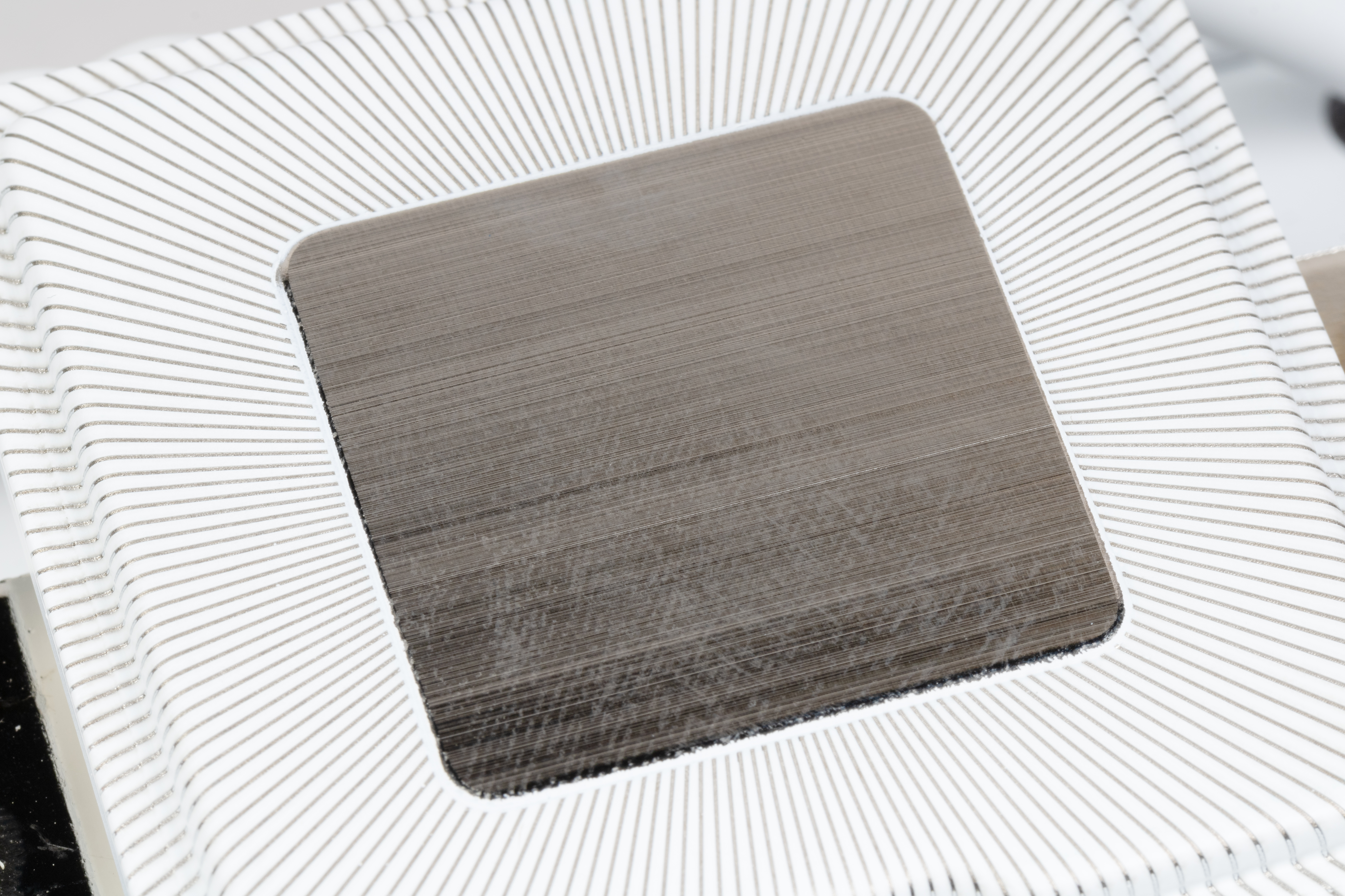 Несмотря на внешний вид, она гладкая. По сути это расплющенная тепловая трубка, имеющая прямой контакт с процессором, и снимающая с него тепло более эффективно, чем традиционные конструкции. Потенциальный минус — очень маленькое пятно контакта: всего 32×32 мм, что значительно меньше «бронекрышки» современных процессоров. Преднанесенного термоинтерфейса нет, но производитель приложил к кулеру небольшой шприц с фирменной термопастой.
