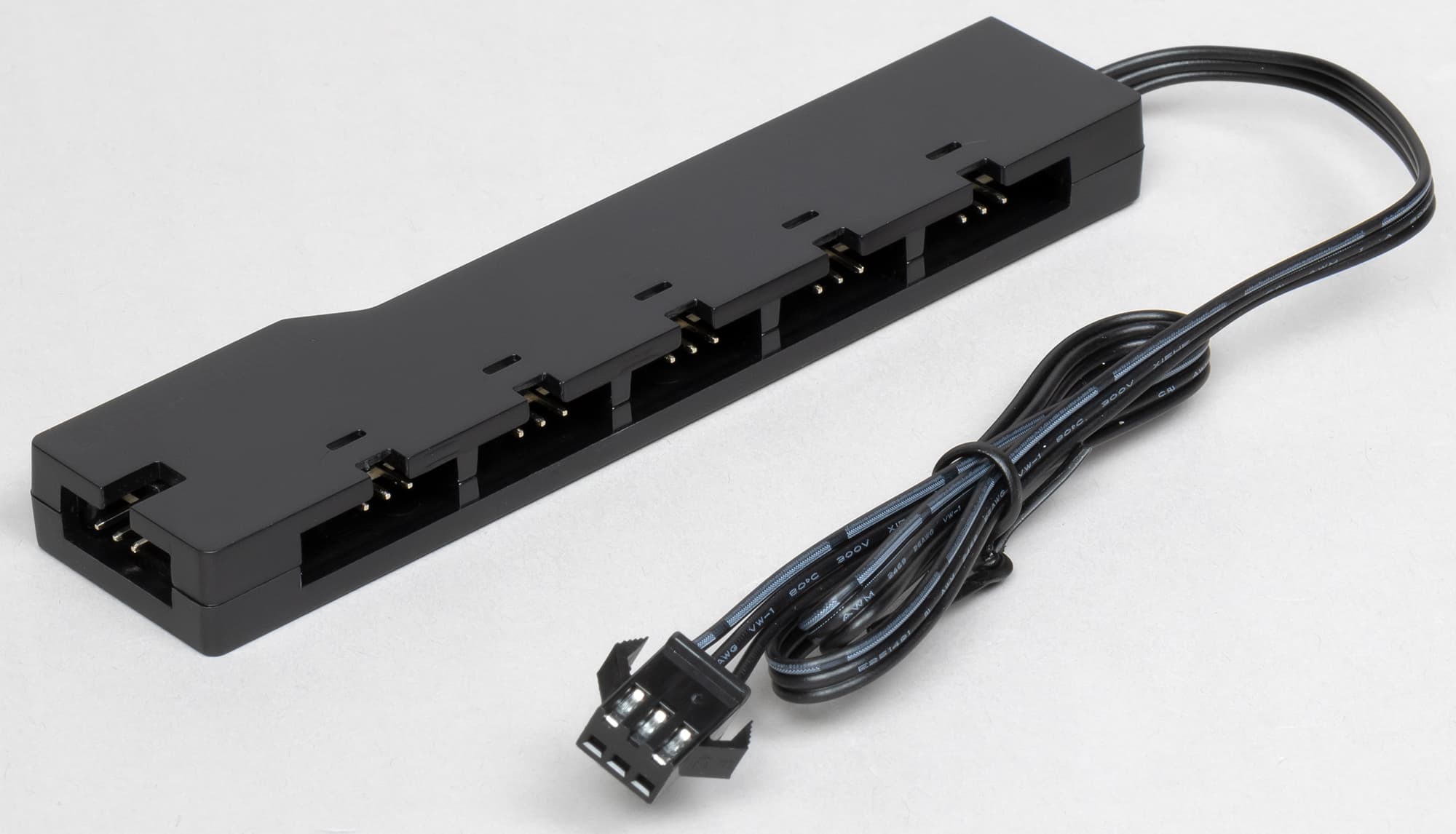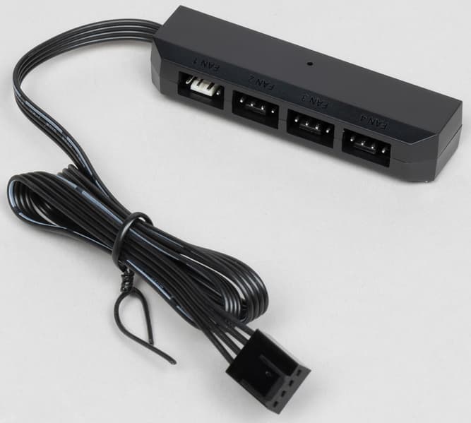 Разветвитель питания вентиляторов представляет собой небольшую коробочку из черного пластика. Ее можно закрепить в корпусе ПК, использовав полоску с клейким слоем снизу.