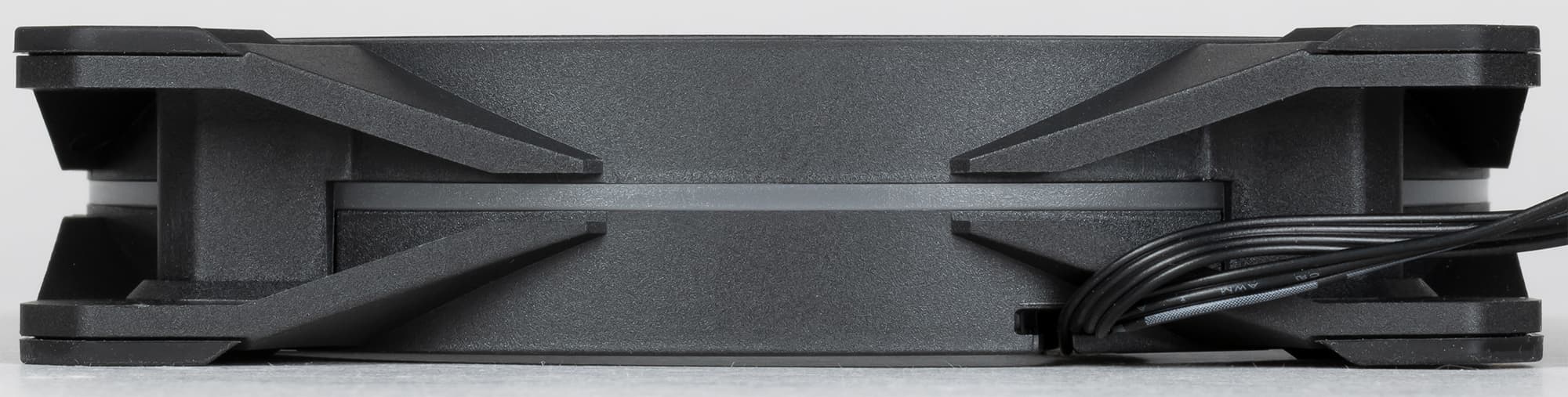 Разбирать вентилятор мы не стали (это невозможно сделать, не испортив вентилятор), поверили производителю, что в нем установлен гидродинамический подшипник (по сути, разновидность подшипника скольжения). От вентилятора, разветвителей и контроллера идут простые плоские кабели, что очень удобно в работе. Вентилятор имеет четырехконтактный разъем (общий, питание, датчик вращения и управление ШИМ) на конце кабеля питания. На подсветку вентилятора идет отдельный кабель с трехконтактным разъемом.