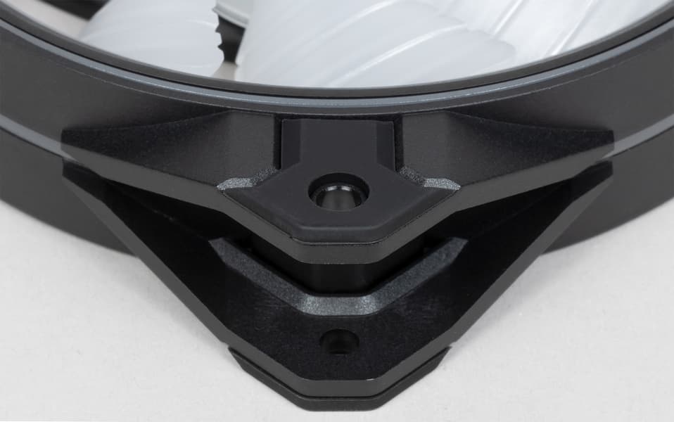 Рамка вентилятора составная: элементы из прочного черного пластика перемежаются со вставками из белого полупрозрачного пластика. Из такого же материала изготовлена крыльчатка вентилятора. Полупрозрачные элементы прикрывают расположенные по кругу многоцветные светодиоды, которые образуют две зоны подсветки: рамка и крыльчатка. Всего используется 18 независимо управляемых адресуемых RGB-светодиода на одном вентиляторе.