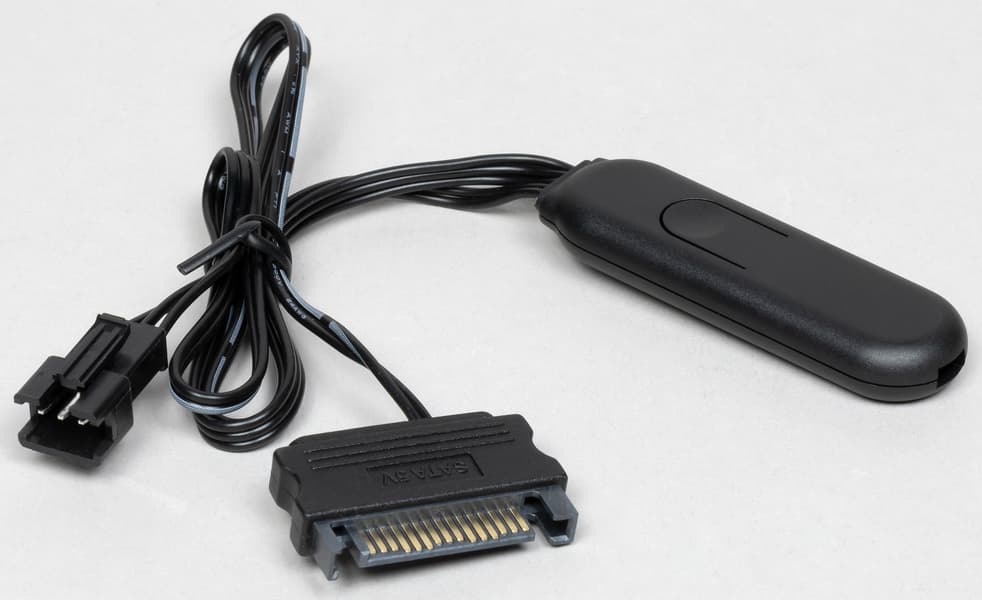 Кабель питания контроллера подключается с помощью разъема питания SATA, что гораздо удобнее, чем к периферийному разъему («Molex»). Единственной кнопкой контроллера перебираются режимы, включается/выключается подсветка крыльчатки (двойное нажатие) и включается/выключается вся подсветка (длинное нажатие). Судя по всему, к контроллеру можно подключить кабель от кнопки сброса, и переключать ей режимы подсветки. Режимы подсветки можно посмотреть на видео ниже: