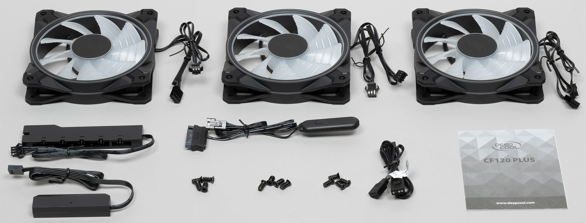 В комплект данного набора входят три описанных вентилятора, по четыре самореза к каждому вентилятору, контроллер подсветки, разветвитель для подсветки, разветвитель питания вентиляторов, кабель для подключения подсветки к стандартному разъему для адресуемой подсветки на материнской плате. Еще есть краткое руководство (в основном в картинках и с надписями на английском языке).