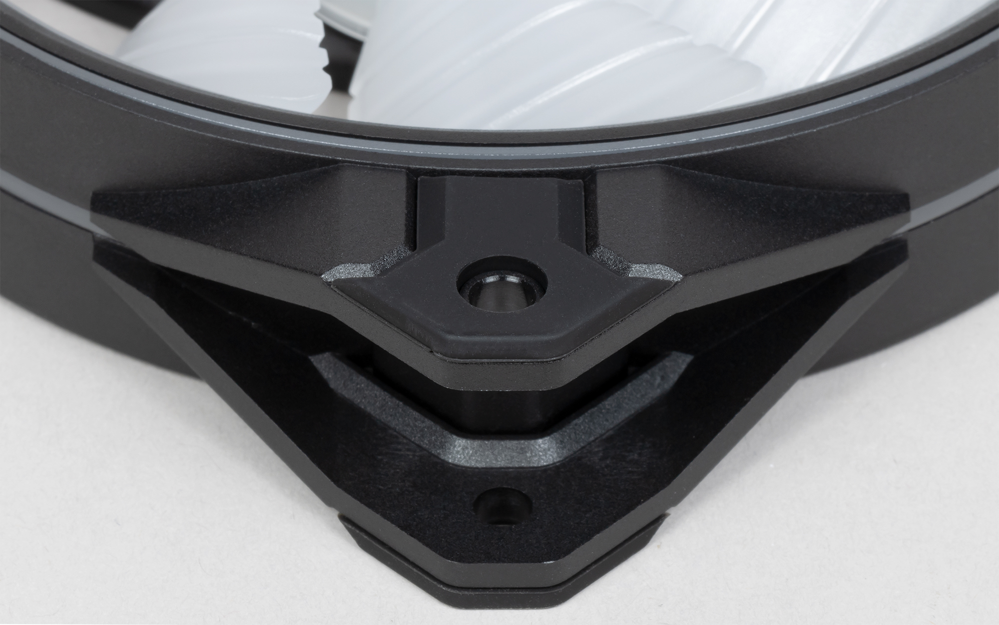На проушины в углах рамки вентилятора наклеены виброизолирующие резиновые накладки. В несжатом состоянии они выступают примерно на 0,75 мм относительно колец на рамке. По замыслу разработчиков, это должно обеспечивать виброразвязку вентилятора от места крепления. Однако если прикинуть соотношение массы вентилятора к жесткости накладок, то становится понятно, что резонансная частота конструкции получается очень высокой, то есть практически никакой виброразвязки быть не может. Кроме того, гнезда, куда вворачиваются крепежные саморезы, являются частью рамки вентилятора, поэтому вибрация от вентилятора будет через саморезы без помех передаваться на то, на чем закреплен вентилятор. В итоге, такую конструкцию проушин можно рассматривать только в качестве элемента дизайна вентилятора.