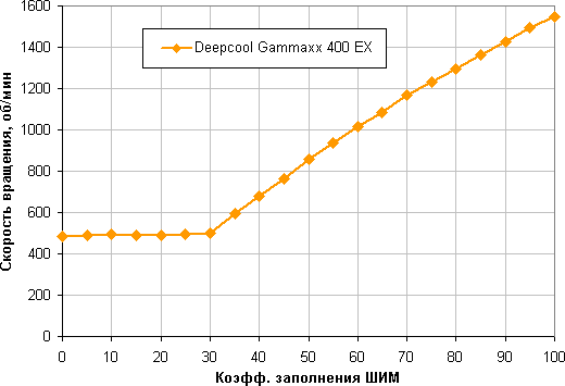 Хороший результат — плавный рост скорости вращения при изменении коэффициента заполнения (КЗ) от 30% до 100% и довольно широкий диапазон регулировки. Отметим, что при КЗ 0% вентилятор не останавливается, поэтому в гибридной системе охлаждения с пассивным режимом на минимальной нагрузке такие вентиляторы придется останавливать, снижая напряжение питания.