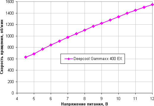 Диапазон регулировки с помощью напряжения заметно уже. Вентилятор останавливается при снижении напряжения до 4,1 В и запускается от 4,3 В. Видимо, вентилятор лучше все же не подключать к источнику с напряжением 5 В.