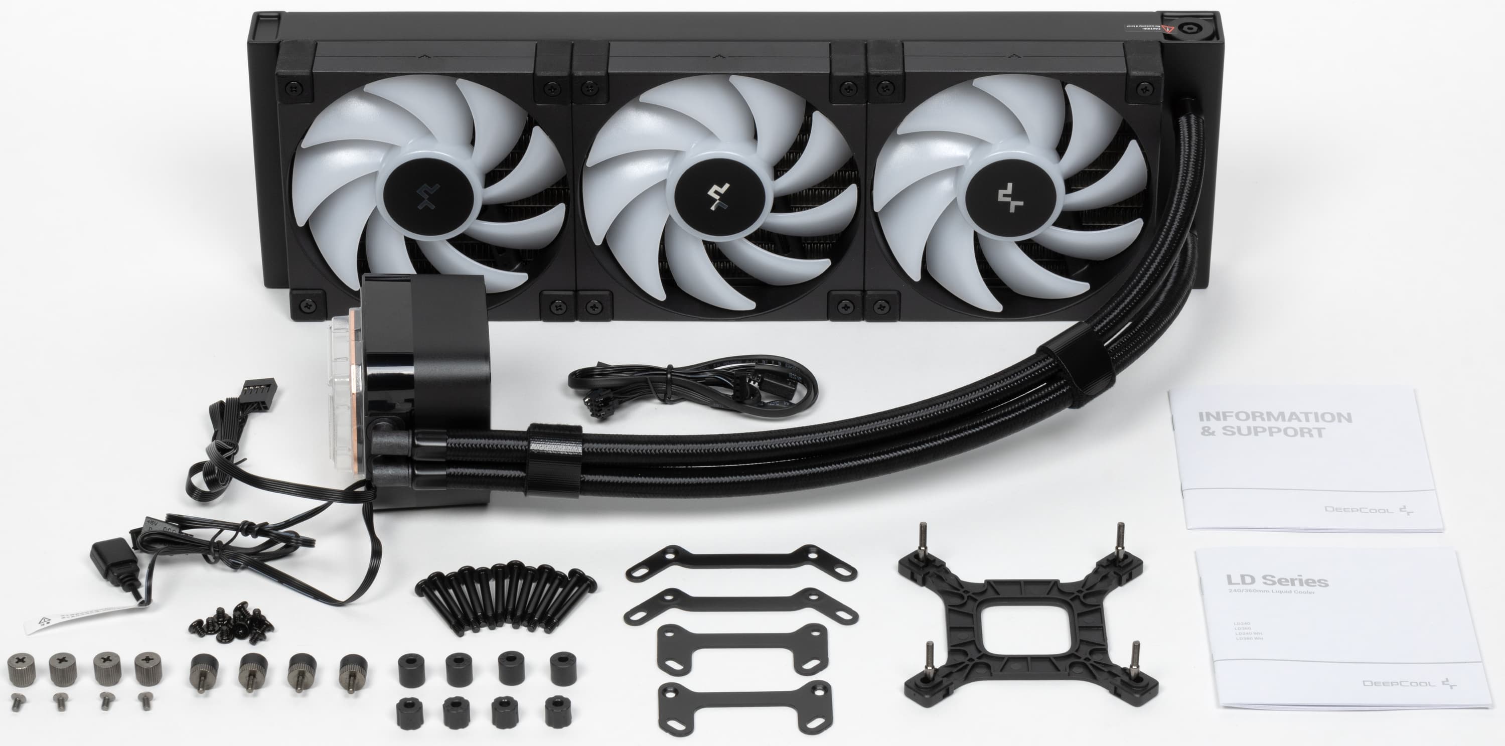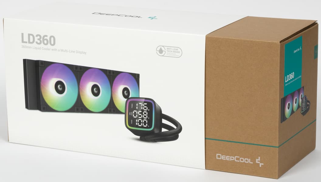 Поставляется система жидкостного охлаждения DeepCool LD360 в коробке из среднего по толщине гофрированного картона. Поверх коробки надет шубер (суперобложка), на котором в цвете изображен сам продукт, а также перечислены основные технические характеристики, приведено описание системы антипротечки (встроенный в радиатор гидроамортизатор) и другая дополнительная информация. Почти все надписи на английском языке и только отсылка на сайт компании за дополнительной информацией продублирована на нескольких языках, включая русский. Для защиты и распределения деталей используются форма из вспененного полиэтилена, картонный чехол на радиатор и пластиковые пакеты. Пакеты с аксессуарами убраны в картонную коробочку, там же в картонном конверте находится документация. Подошва теплосъемника и термопаста на ней защищены фигурной накладкой из прозрачного пластика.
