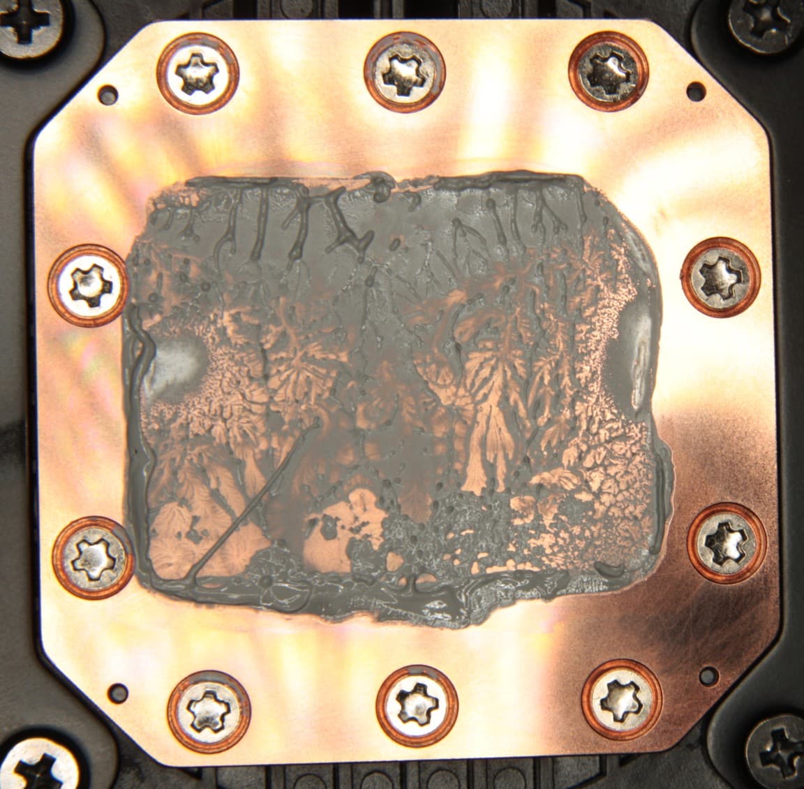 Видно, что термопаста распределилась тонким слоем на всю площади крышки процессора, а ее избытки выдавились за края. Участки плотного контакта расположены по краям, что странно. Отметим, что крышка этого процессора сама по себе чуть выпуклая к центру. (Распределение термопасты, конечно, изменилось при разъединении процессора и помпы.)