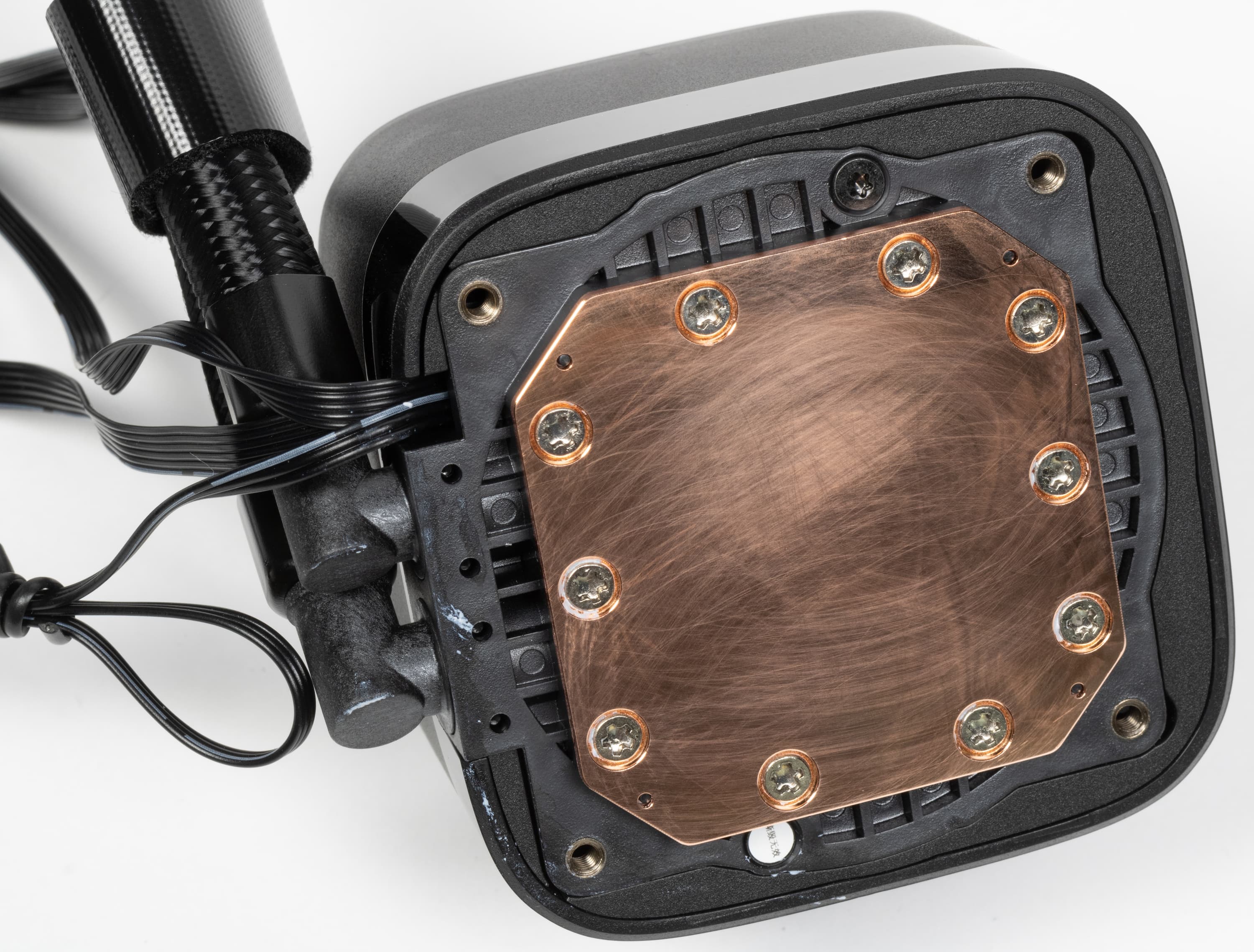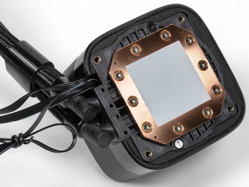 Система герметичная, заправлена, готова к использованию. Помпа интегрирована в один блок с теплосъемником. Подошвой теплосъемника, непосредственно прилегающей к крышке процессора, служит медная пластина. Ее внешняя поверхность ровная, шлифованная и слегка полированная. К центру она выпуклая с перепадом порядка 0,2—0,3 мм.
