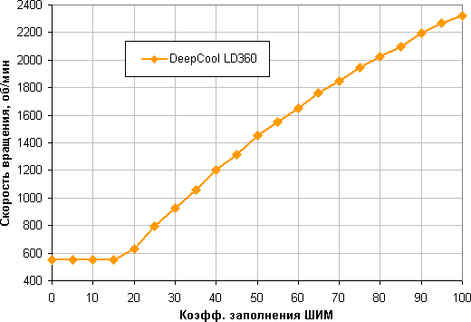Хороший результат — монотонный рост скорости вращения при изменении коэффициента заполнения от 15% до 100%, диапазон регулировки скорости вращения широкий. При снижении коэффициента заполнения (КЗ) до 0% вентиляторы не останавливаются. Это может иметь значение, если пользователь хочет создать гибридную систему охлаждения, которая при низкой нагрузке работает полностью или частично в пассивном режиме.