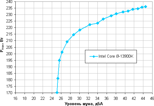 Приняв 25 дБА за критерий условной бесшумности, получим примерную максимальную мощность процессоров, соответствующих этому уровню. С небольшой натяжкой это 170 Вт для процессора Intel Core i9-13900K. Если не обращать внимания на уровень шума, то пределы мощности можно увеличить примерно до 236 Вт. Еще раз уточним, это в жестких условиях обдува радиатора нагретым до 44 градусов воздухом, при снижении температуры воздуха и/или увеличении максимально допустимой температуры процессора (для него допустимы 100 °C) указанные пределы мощности для бесшумной работы и максимальной мощности возрастают.