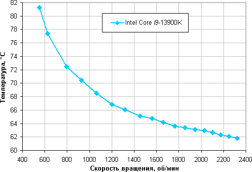 В этом тесте процессор Intel Core i9-13900K не перегревается (при 24 градусов окружающего воздуха) на оборотах вентиляторов, достигаемых при снижении КЗ до 15%, что соответствует примерно 550 об/мин. При этом максимальное потребление по данным мониторинга составило порядка 214 Вт, а по разъемам для питания процессора — 271 Вт. Напомним, что базовая мощность этого процессора составляет всего 125 Вт, а штатная максимальная кратковременная (турбо-лимит) — 253 Вт.