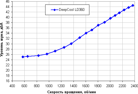 Уровень шума этой системы охлаждения меняется в широком диапазоне. Зависит, конечно, от индивидуальных особенностей и других факторов, но где-то от 40 дБА и выше шум, с нашей точки зрения, очень высокий для настольной системы; от 35 до 40 дБА уровень шума относится к разряду терпимых; ниже 35 дБА шум от системы охлаждения не будет сильно выделяться на фоне типичных небесшумных компонентов ПК — корпусных вентиляторов, вентиляторов на блоке питания и на видеокарте, а также жестких дисков; а где-то ниже 25 дБА кулер можно назвать условно бесшумным. Фоновый уровень был равен 16,8 дБА (условное значение, которое показывает шумомер). Помпа работает довольно громко — порядка 25 дБА, и снизить скорость ее вращения затруднительно. Соответственно именно помпа и определяет минимальный уровень шума от всей системы.