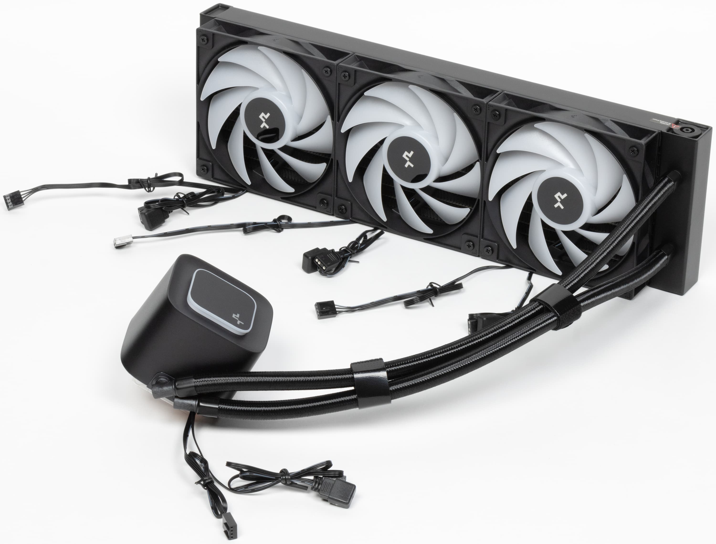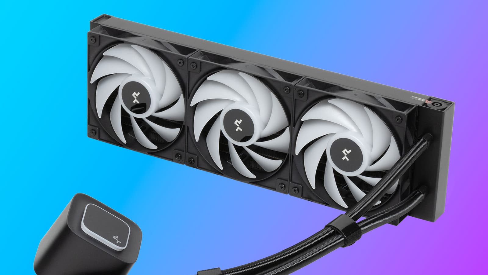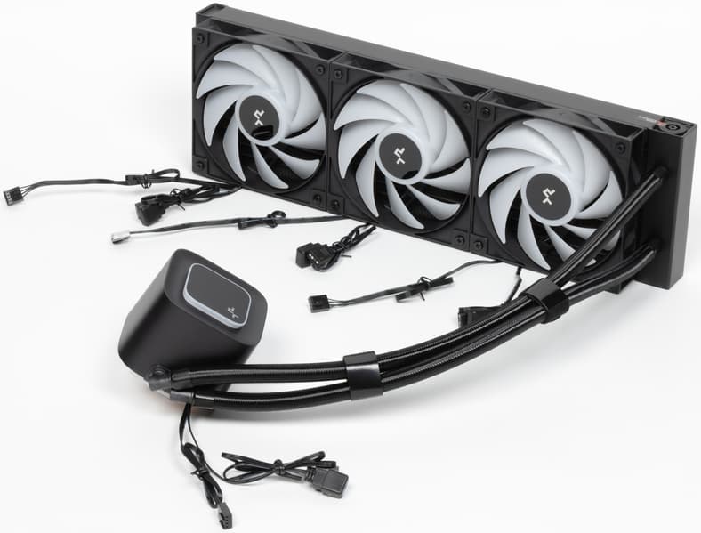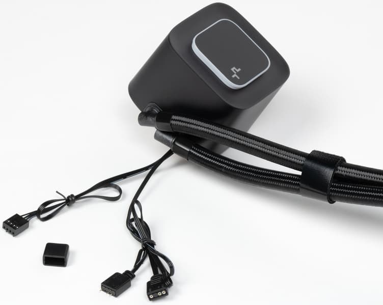 Вообще блок помпы выглядит очень похоже на LQ360 не только со стороны теплосъемника, но начинка в нем, скорее всего, другая. Во-первых, DeepCool никогда не упускает шанса похвастаться помпами, так что у LQ360 прямо на корпусе написано, что помпа уже пятого поколения, а в данном случае — полная тишина. Во-вторых, что серьезнее, в отличие от более дорогих моделей здесь реализовано управление скоростью вращения помпы посредством ШИМ. А это позволяет без серьезных усилий регулировать и уровень шума — то самое техническое отличие, о котором было сказано в начале. Насколько эффективное — проверим.