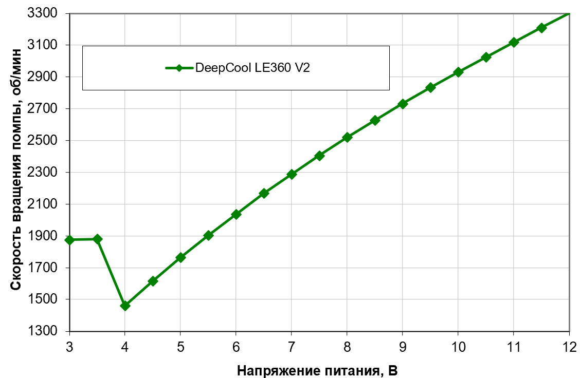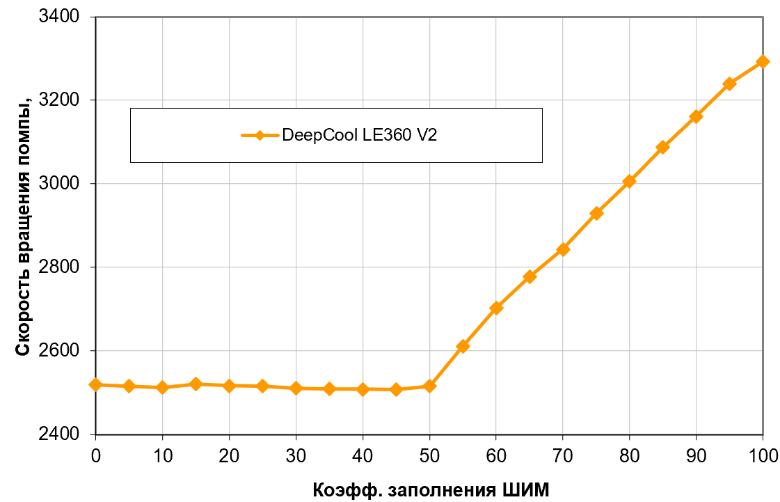 К управлению вращением помпы посредством ШИМ помпой в DeepCool подошли очень ответственно. Считается, что для долгой надежной работы помп с гидродинамическим подшипником скорость вращение крайне нежелательно снижать ниже 50% от максимальной, а лучше вообще держать выше 2/3 максимальных оборотов. Последнее (с небольшим запасом) мы и получаем — обороты после небольшого снижения стабилизируются на 2500. Хватит ли этого для условной бесшумности, а не только тишины — проверим позднее.