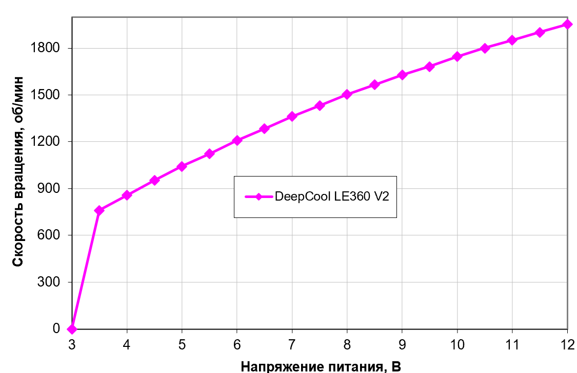 В данном же случае шум в принципе не слишком высок — многие СЖО на максимуме уверенно рвутся к 50 дБА. Регулирование оборотов помпы на минимальном уровне шума сказалось благотворно, но хорошо видно, что ниже 2500 об/мин замедлять помпу нужды нет, так что и правильно, что на этом уровне процесс останавливается.
