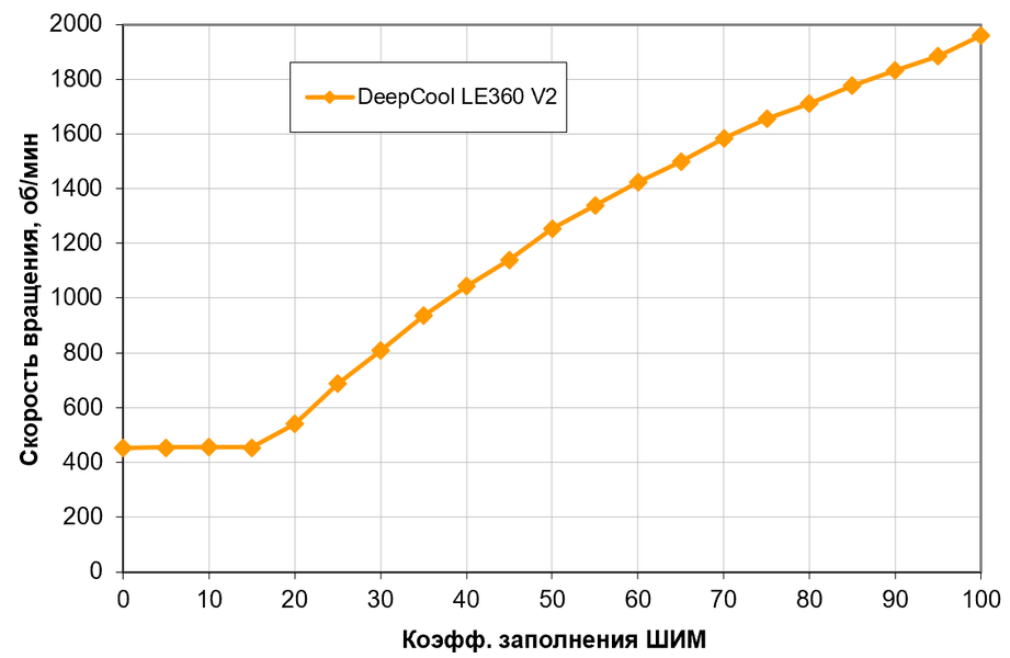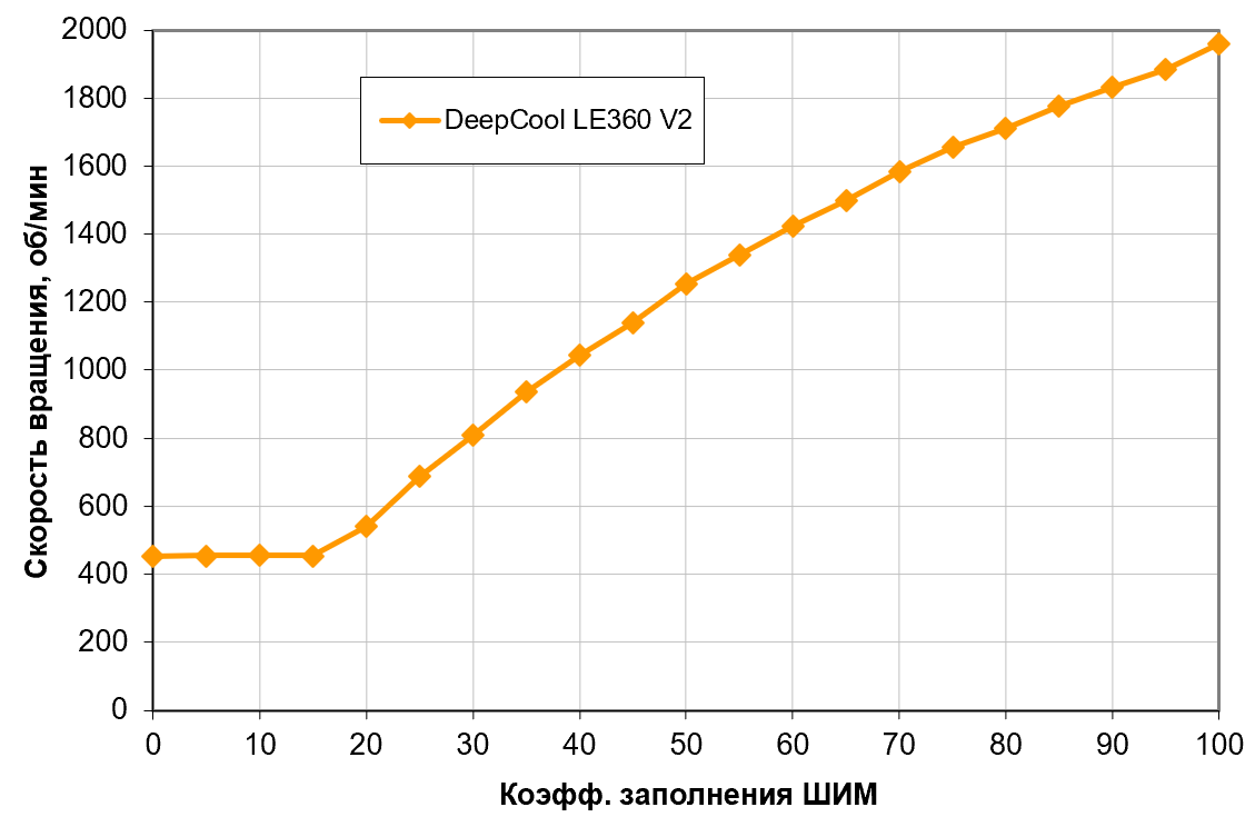 Хороший результат: монотонный рост скорости вращения при изменении коэффициента заполнения от 15% до 100%, диапазон регулировки скорости вращения широкий. При снижении коэффициента заполнения (КЗ) до 0% вентиляторы не останавливаются, а стабилизируются примерно на 450 об/мин (минимальные по паспорту, напомним, 500 об/мин). Это может иметь значение при желании создать гибридную систему охлаждения, при низкой нагрузке работающую (полностью или частично) в пассивном режиме. Поведение очень похоже на, например, вентиляторы DeepCool LQ360, но конкретные значения различаются.