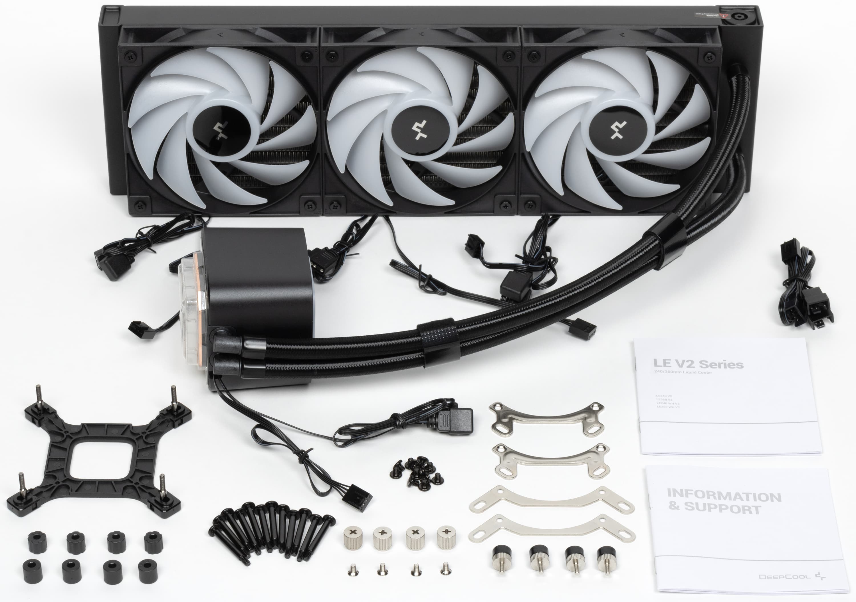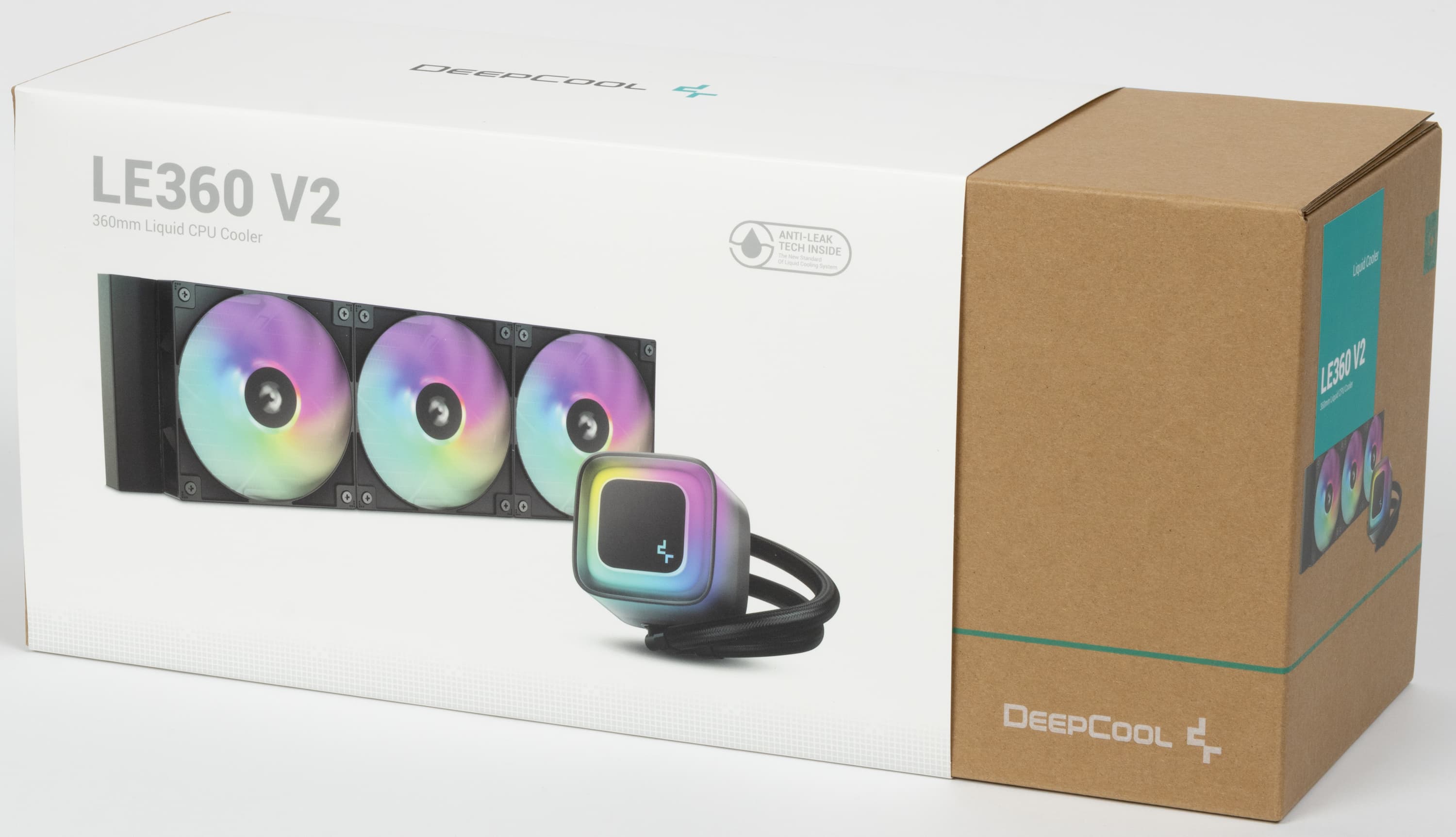 Поставляется система жидкостного охлаждения DeepCool LE360 V2 в коробке из среднего по толщине гофрированного картона. Поверх коробки надет шубер (суперобложка), на котором в цвете изображен сам продукт, а также перечислены основные технические характеристики, приведено описание системы антипротечки (встроенный в радиатор гидроамортизатор) и другая дополнительная информация. Почти все надписи — на английском языке, и только отсылка на сайт компании за дополнительной информацией продублирована на нескольких языках, включая русский. Для защиты и распределения деталей используются форма из вспененного полиэтилена, картонный чехол на радиатор и пластиковые пакеты. Пакеты с аксессуарами убраны в картонную коробочку, там же в картонном конверте находится документация. Подошва теплосъемника и термопаста на ней защищены фигурной накладкой из прозрачного пластика.