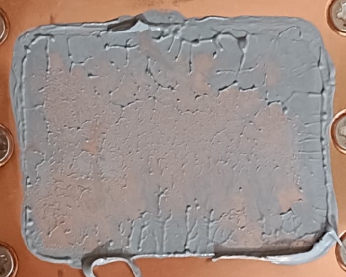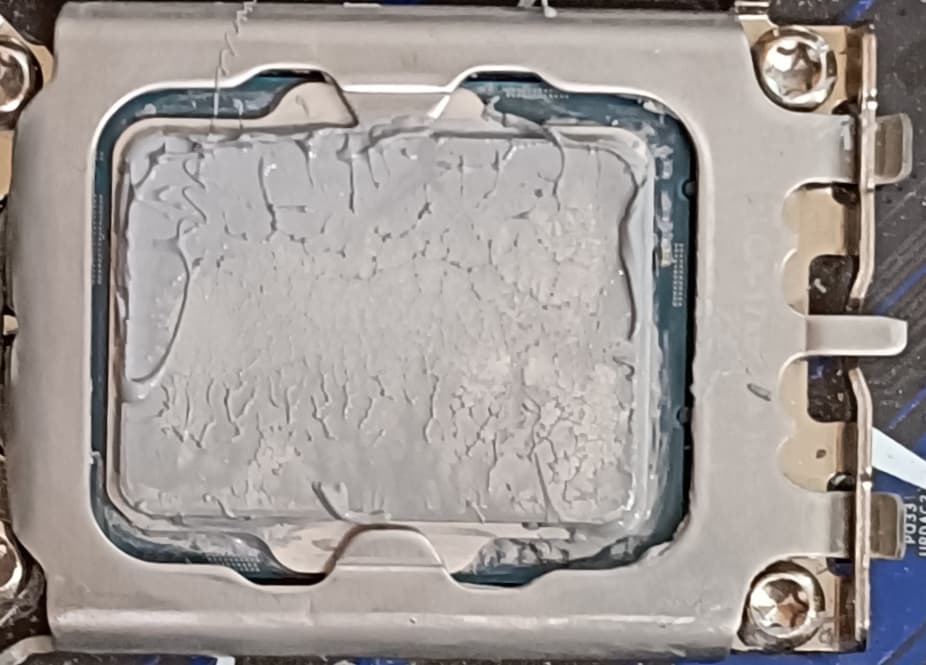 В тестах для унификации мы всегда используем одинаковую качественную термопасту для всех устройств, приобретенную в обычном магазине. Забегая вперед, продемонстрируем ее распределение после завершения всех тестов. На процессоре Intel Core i9-13900K:
